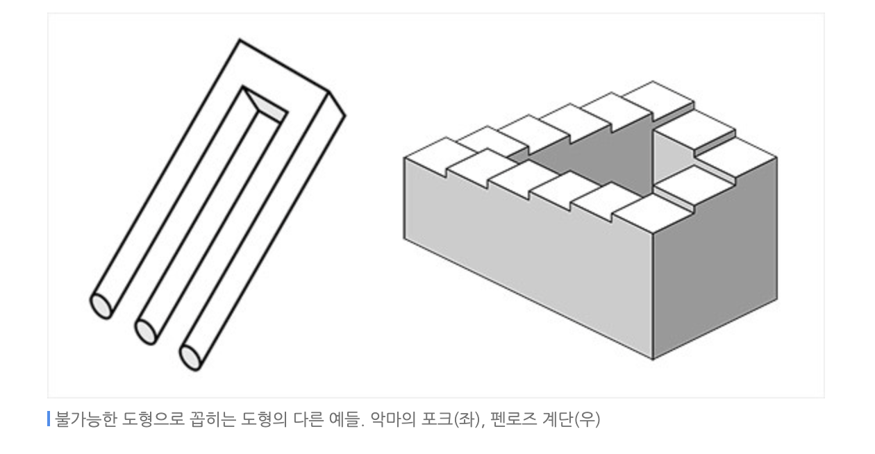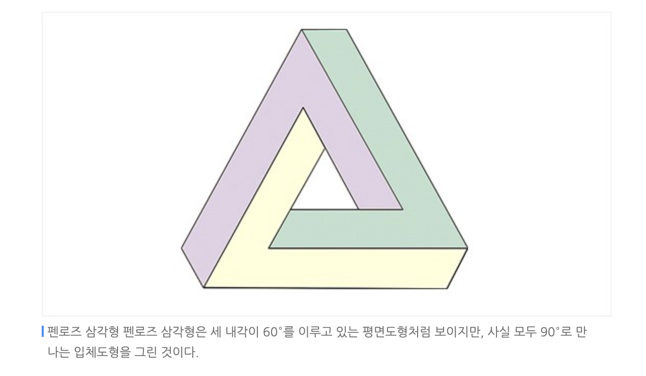 에셔가 수학적인 작품을 완성할 수 있도록, 가장 가까이에 서 영향을 준 사람은 바로 영국의 수학자 로저 펜로즈다. 펜로즈는 ‘불가능한 도형 : 시각적 착시의 특별한 형태’라는 용어를 처음 사용하며 세상에 알려졌다. 사실 펜로즈 삼각형은 자세히 관찰하지 않으면 아무런 문제가 없는 삼각형 구조처럼 보인다. 하지만 이 삼각형의 내각을 집중해서 살펴보면 이상한 점을 발견할 수 있다.